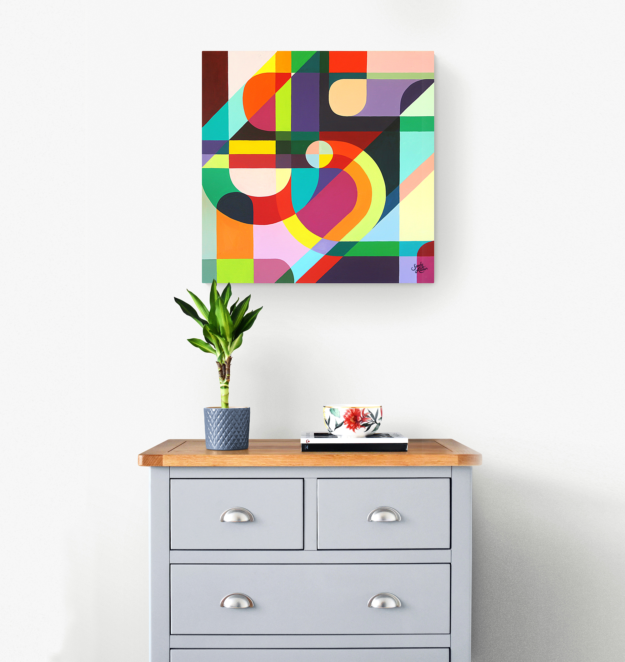 The artistic process to create these geometric abstracts, is a balance of constraint and freedom. Intuition and consideration. All hand-drawn, no rulers, no masking tape. An exploration of colour and form. I enjoy combining seemingly random colours, shapes and angles to create an image that replicates the ‘beautiful chaos’ of nature. Using multicolours, acrylic on canvas mostly, I let the painting unfold – allowing the next colour to appear, trusting it will fill the right space. Resulting in a harmonious composition comprising a pleasing series of lines, shapes and angles that fit together to take your eye on your own uplifting journey that never ends, encouraging your eye to move around the connecting shapes.