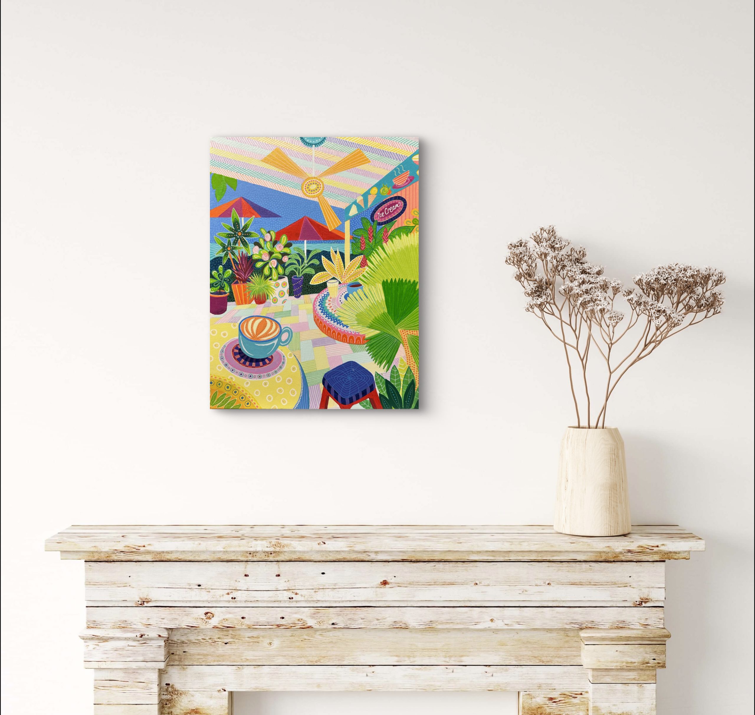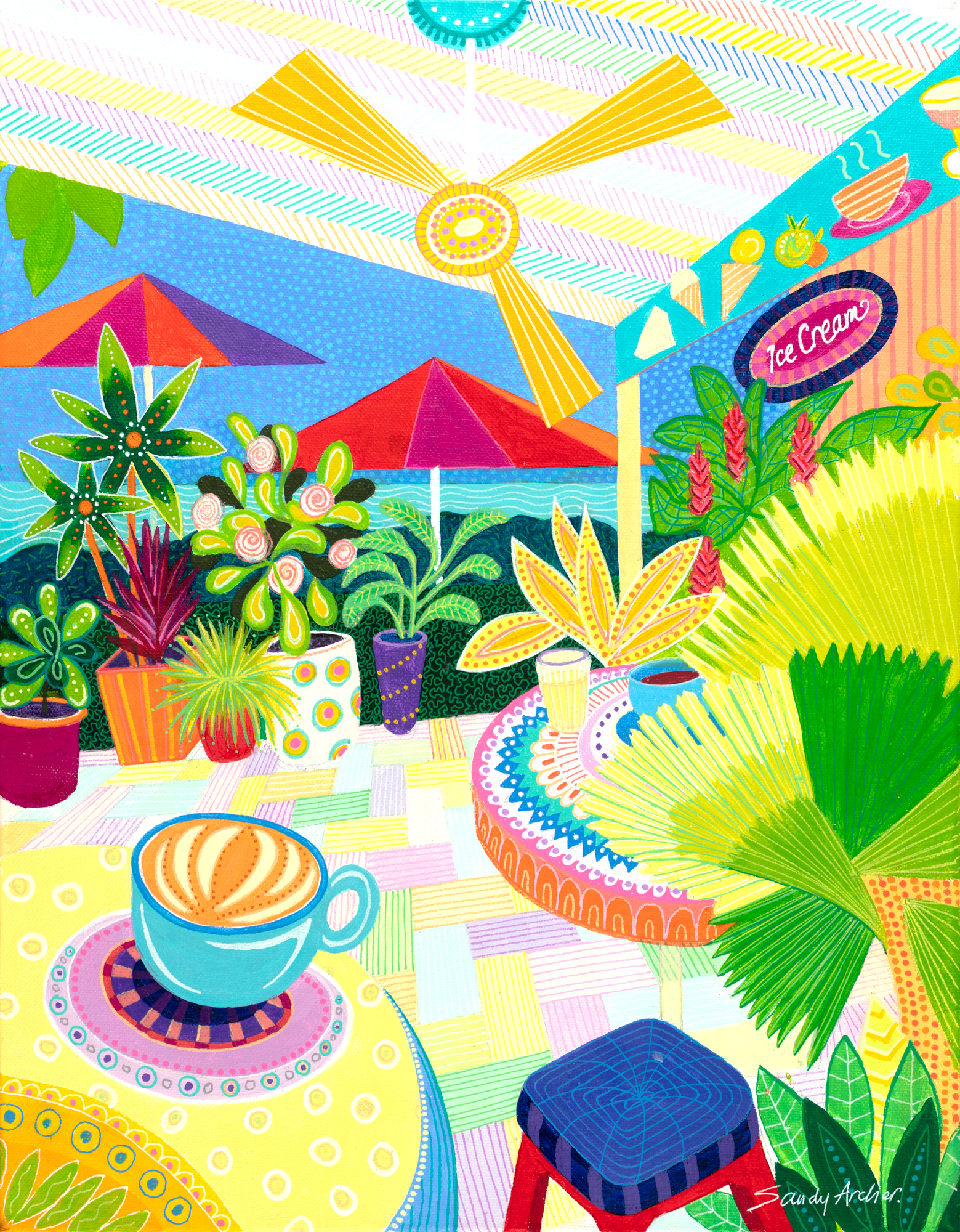 Port Douglas is close to where I live, and we love to go there regularly. The vibrant lifestyle, the intense colours and the relaxed vibe inspired me to paint this colourful depiction of the cafe life we love so much.