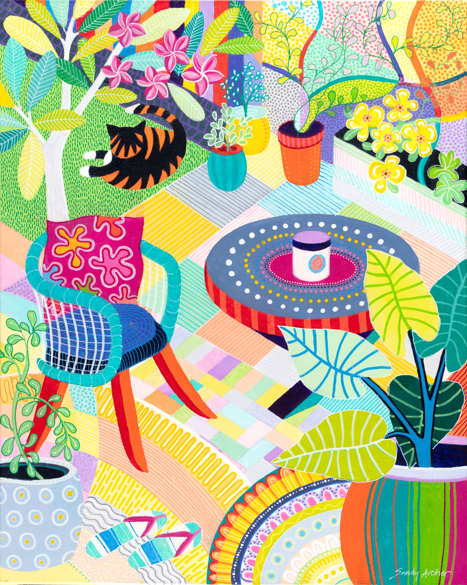 The ‘Places I Love’ series is about capturing and sharing a joyful experience of a special moment in time through colourful art and design. A walk in the park, a day in the country, walking the dog – all moments that can pass you by if you don’t stop and look. I like to re-interpret the place and the people, to reflect the experience in the moment. I enhance the joy, the light, the colours – until I feel I am there once again. The art is a unique and colourful story that draws you in to a time and a place that feels joyful and reminiscent.