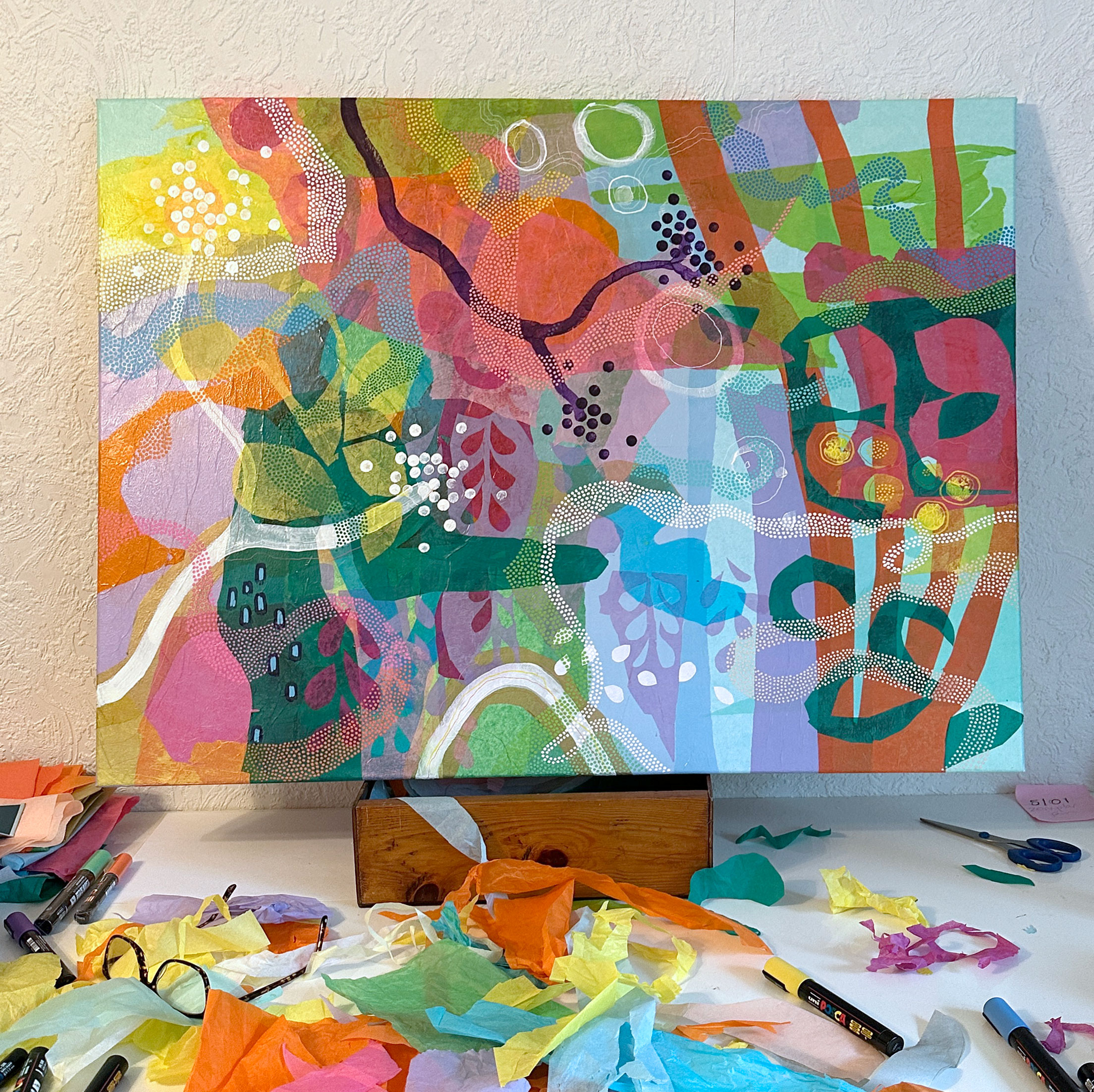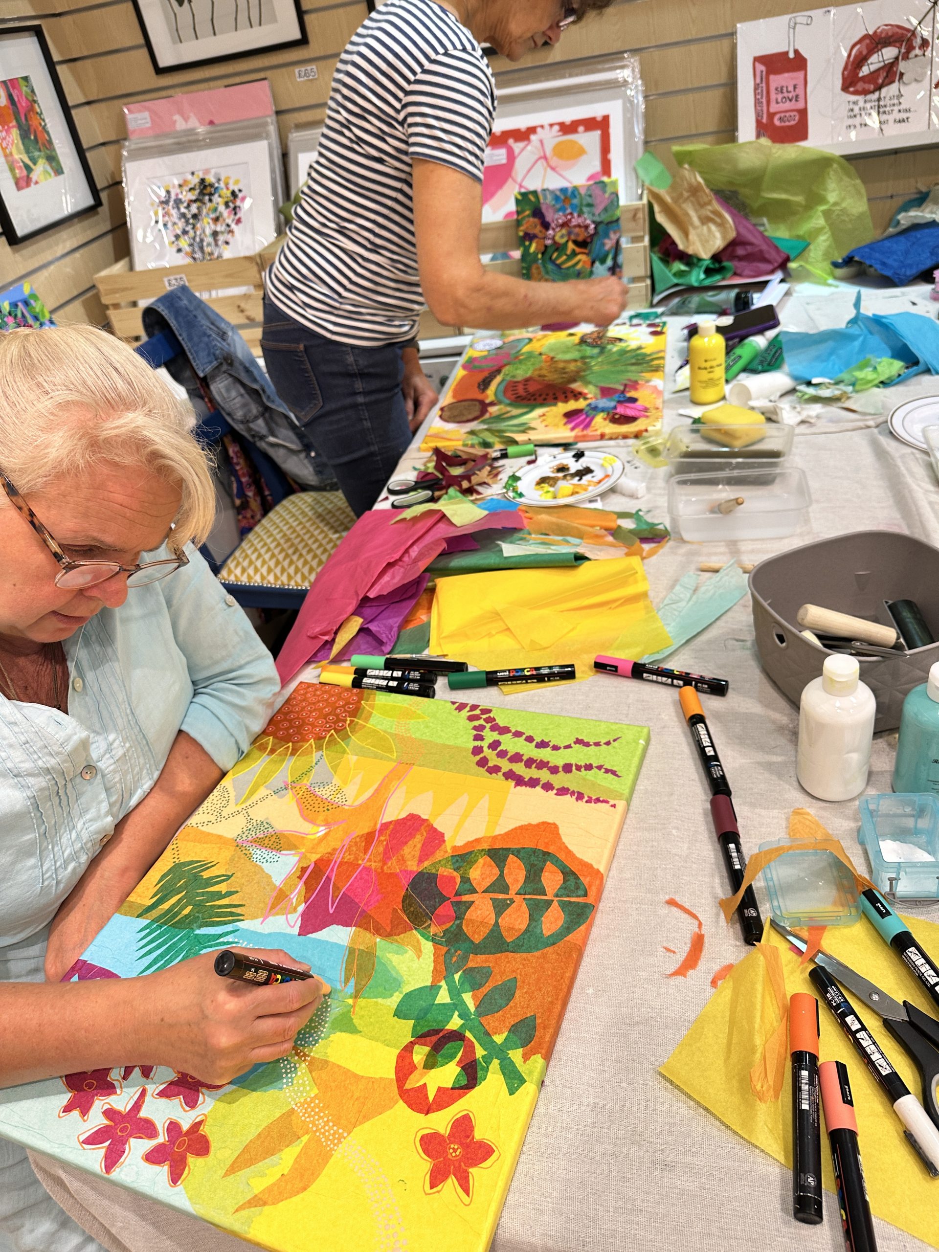 An uplifting and exploratory series of workshops introducing my signature collage technique using acrylic paint, Posca pens, and tissue paper.